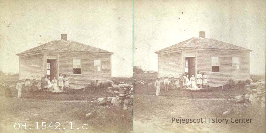A B/W stereograph of the #2 School House in North Harpswell, ME which was built in 1822. It was the Waterman cottage. Undated