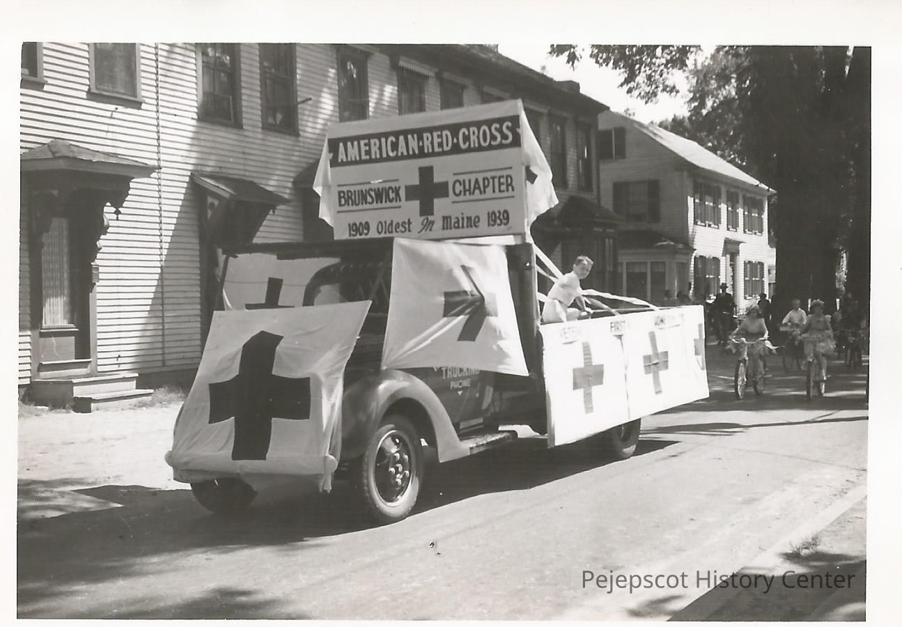 A B/W photo of a Red Cross float in Brunswick's 200th Anniversary parade. Undated