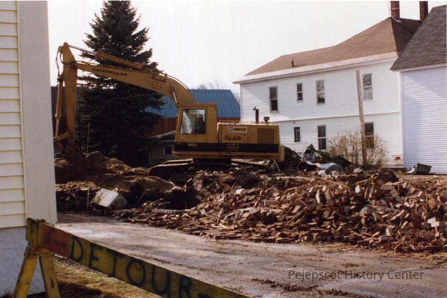 A color photograph of the demolition of the house at 21-23 Dunning St., Brunswick, Maine. 1/1992