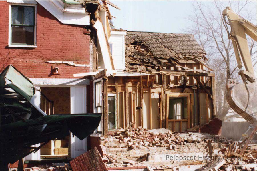 A color photograph of the demolition of a building at #21 -23 Dunning Street, Brunswick, ME. 1/1992.