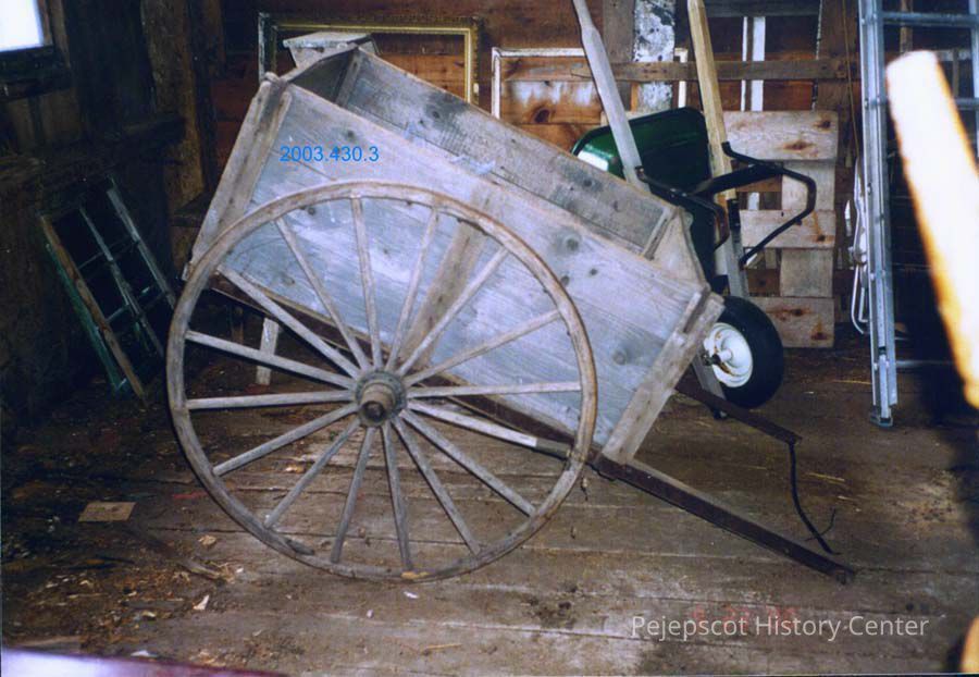 A color photograph taken about 200 shows a two-wheeled cart in the barn at 24 Elm Street, Topsham, Maine.