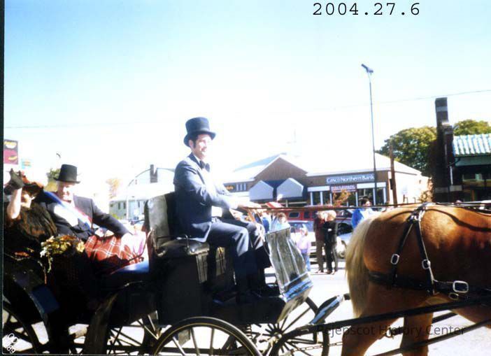 A color photograph of Brunswick's 250th Anniversary Parade (Oct 1989) showing a horse and wagon. The driver and two passengers are dressed in period clothes. Casco Northern Bank is in the background.