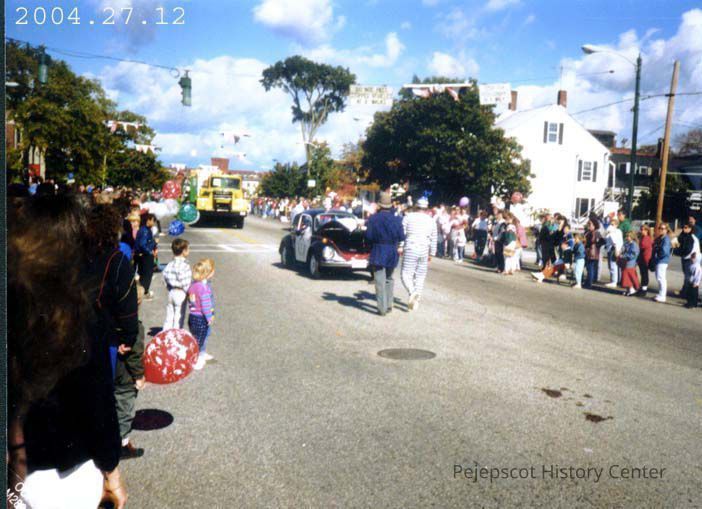 A color photograph of Brunswick's 250th Anniversary Parade (Oct 1989) showing two men in period costume (one a cop, the other in prison grab) walking back toward the parade on Maine Street. There is also a Volkswagen Beetle in the photo.