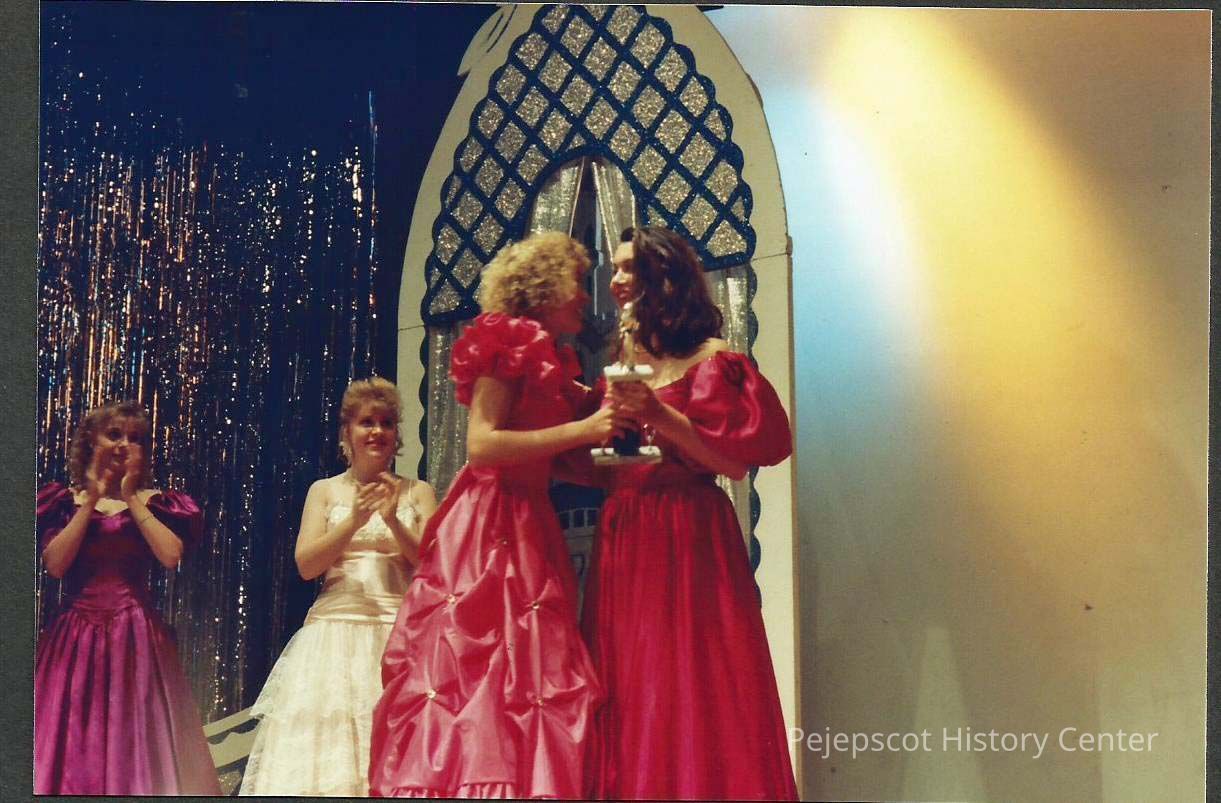 A color photograph of 2nd runner-up Cara Martin receiving her trophy from Robin Moody.