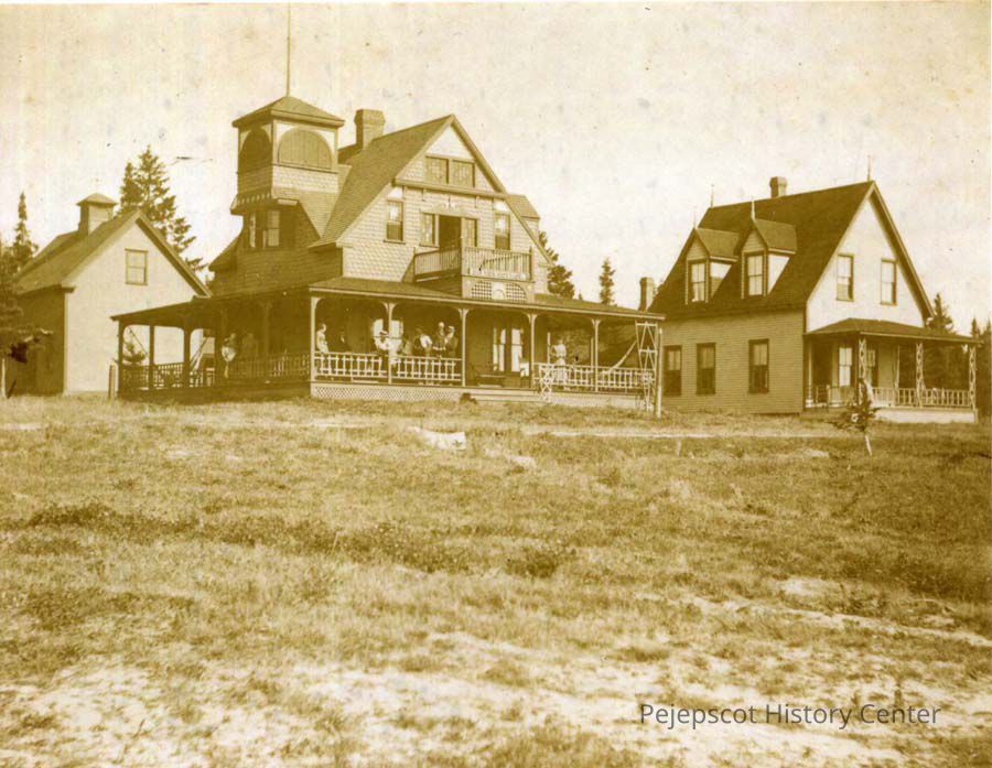B/W photo of the house (left) at 36 East Marginal Road, Mere Point, Brunswick, ME. People on the front porch. It was renumbered from 36 to 29 East Marginal Road prior to 2000. Undated.