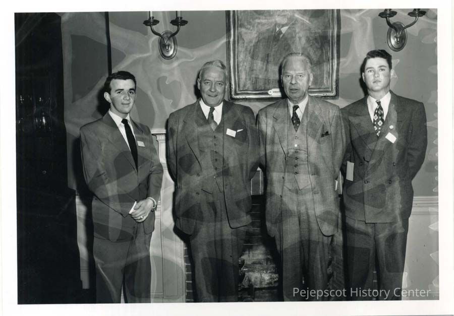 Black and white photograph of 4 men in front of a fireplace - Cancer Society at Moulton Union