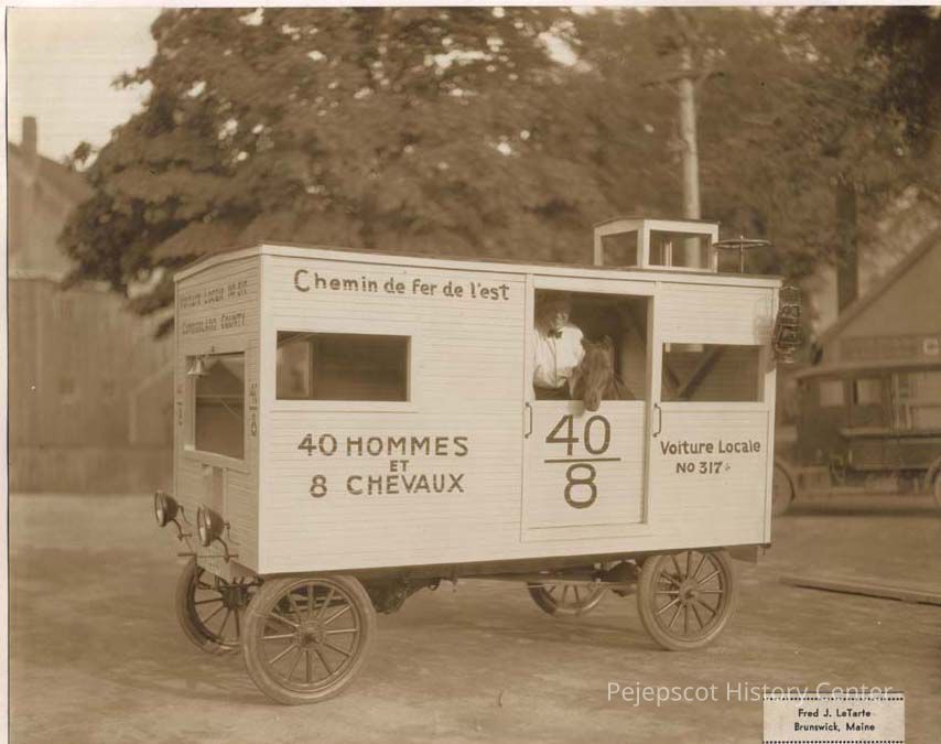 An undated black and white photo of a 40 and 8 wagon, a rail car used during World War I, it could hold 40 men or 8 horses. After the war, a group of veterans formed The Forty and Eight (La Societe des Quarante Hommes et Huit Chevaux) that was part of the American Legion.