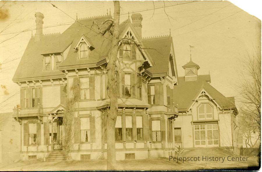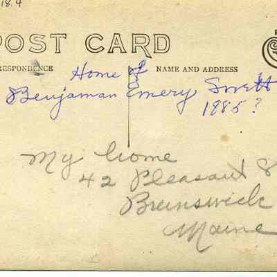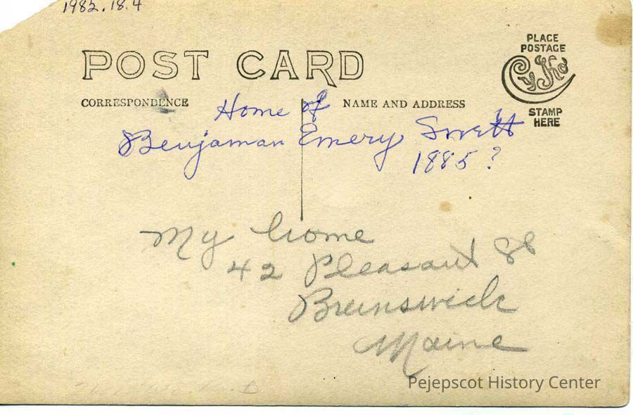 A sepia postcard of the house at 42 Pleasant Street, Brunswick, Maine. Not mailed. Possibly from 1885. On back: Home of Benjamin Emery Swett.