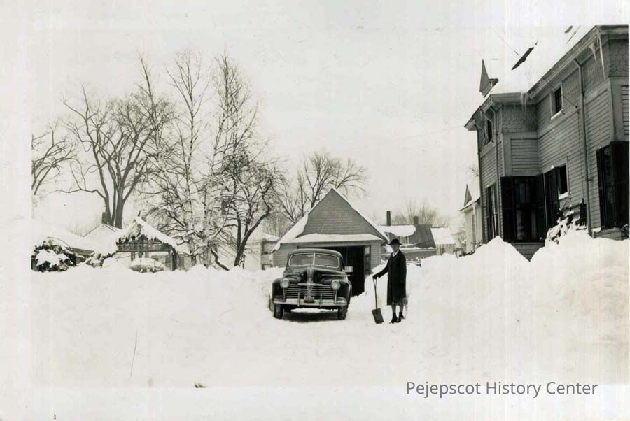 B/W photo of Mrs. Thomas Riley in front of her home at 42 Pleasant Street. Inscribed on the back: "Jan. 11. 1944 snowstorm of Jan. 5&6 About 3 ft of heavy snow shoveled after several days". 1/11/1944.
