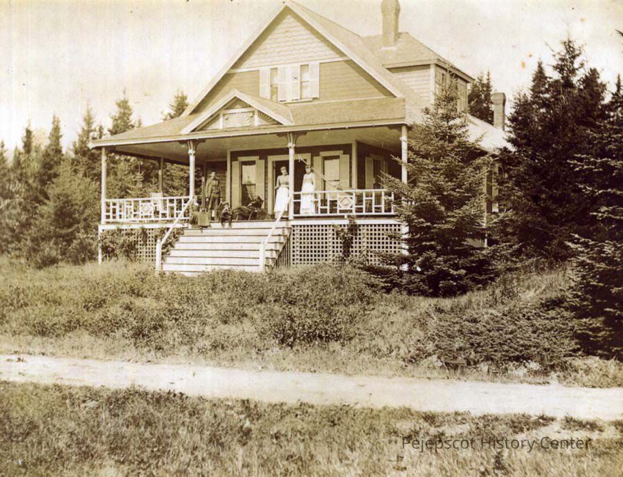 B/W photo of the house at 44-46 East Marginal Road, Mere Point, Brunswick, ME. People on the front porch. Undated.