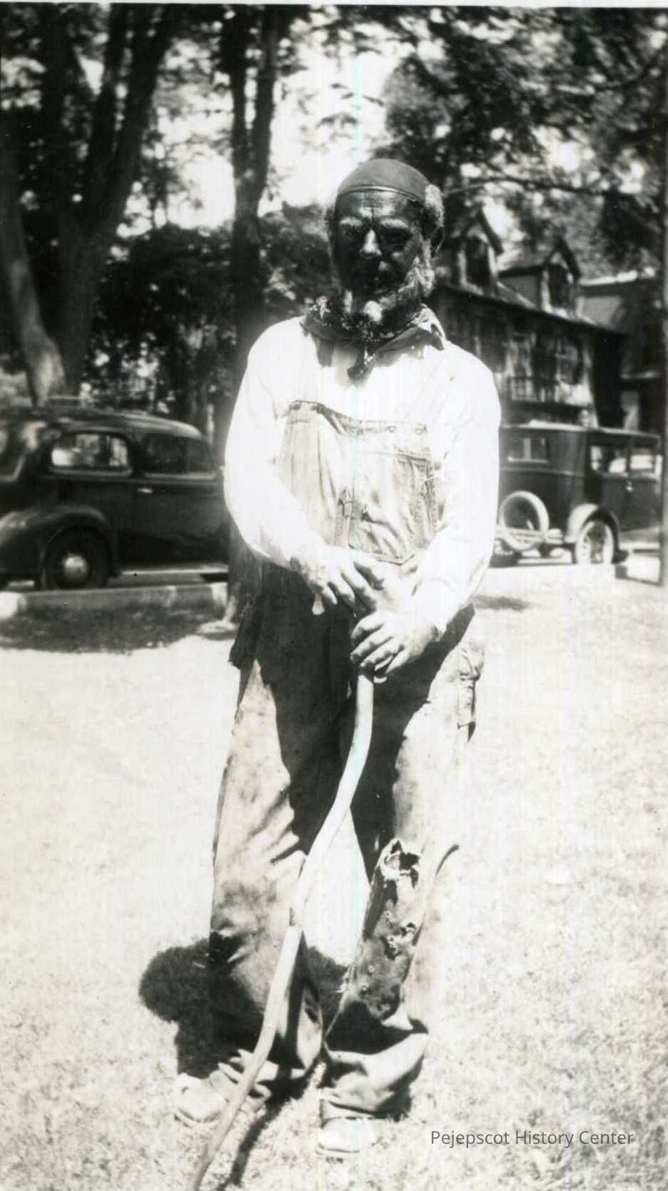Warning this image contains inaccurate racial stereotypes. B/W photo of 4th of July parade, Brunswick ME, showing Don Potter with his face blackened. 1939. He is supposed to represent Uncle Tom of Harriet Beecher Stowe's "Uncle Tom's Cabin".
