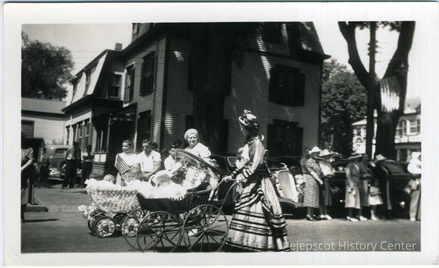 A B/W photo of Brunswick's Fourth of July Parade 1939 Two women pushing early baby carriages.