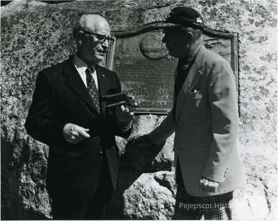 Photo of ceremony honoring 50th anniversary of "Around the World Flyers", 1974, at Mere Point Monument Rock, Brunswick, Maine. Gen. Leigh Wade (right), and Adm. Mayo Hadden, U.S.N. Ret. (left).Lexicon