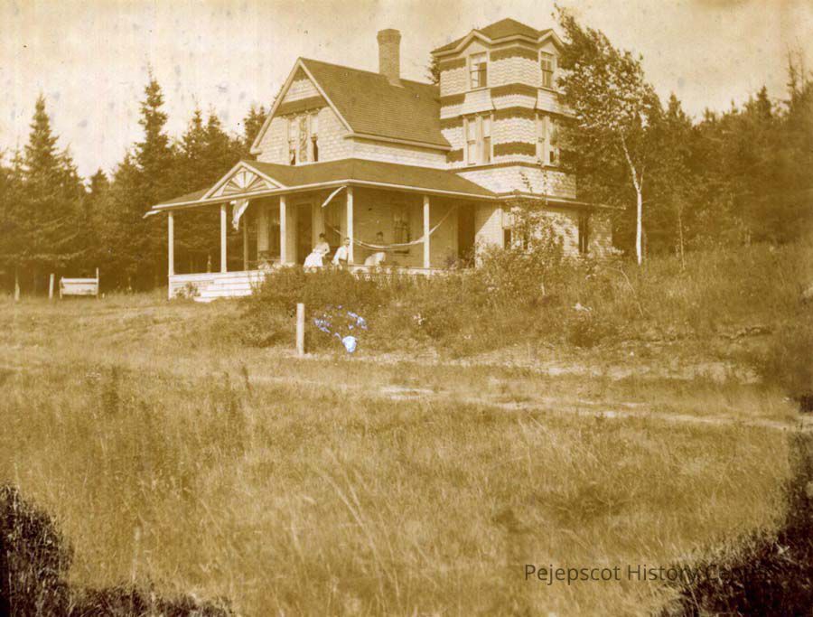 B/W photo of the house at 61 West Marginal Road, Mere Point, Brunswick, ME. People are sitting on the front porch. Undated.
