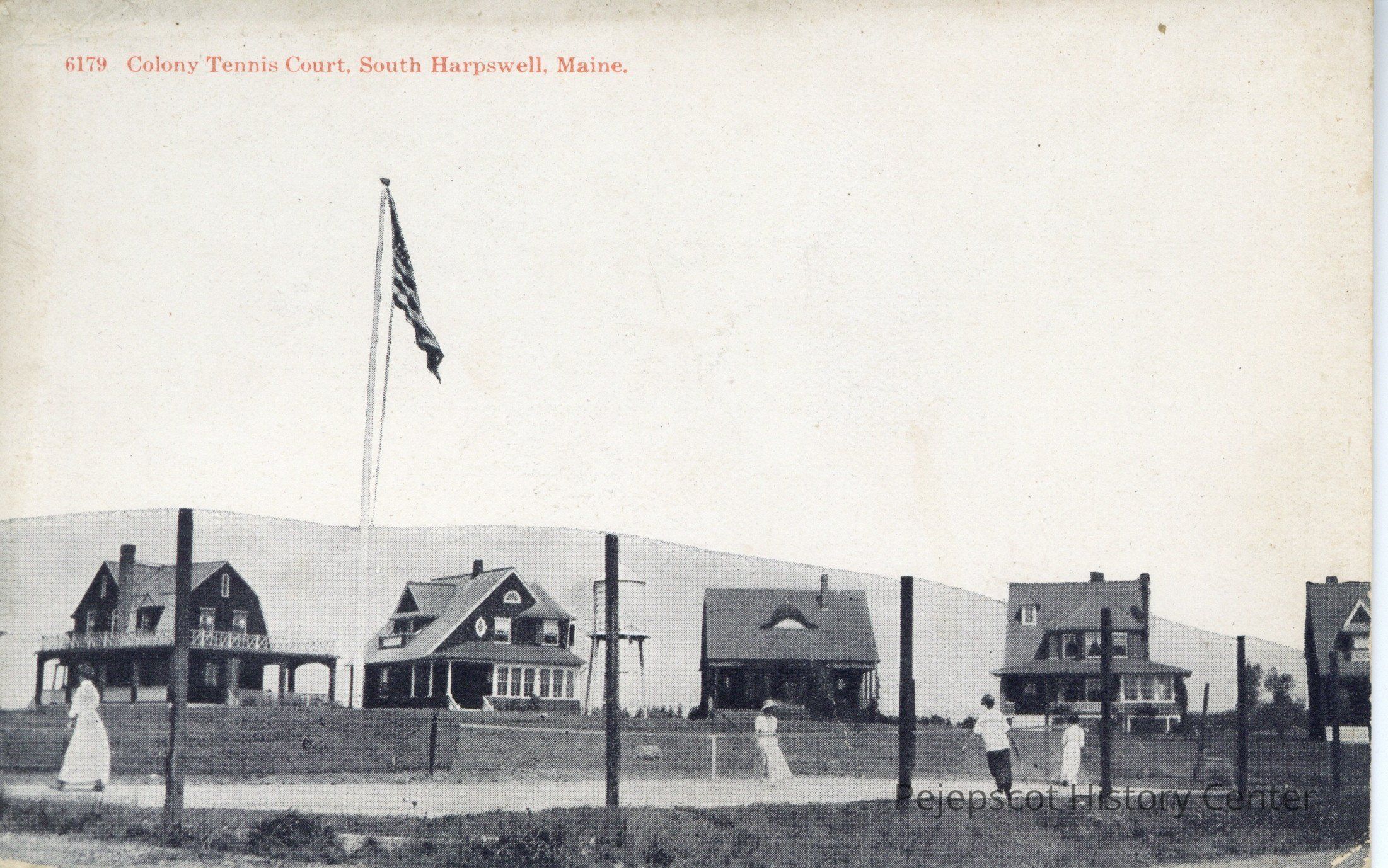 Black and white photo postcard of the Colony tennis court, South Harpswell, Maine.Collection