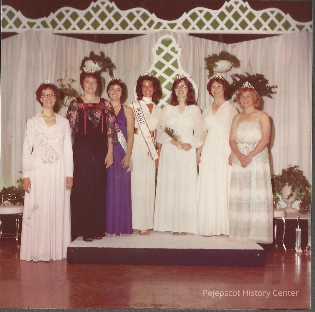 L. to R. Agnes Racine Parker Teen Queen 1972, Kristine Warming Wentworth Teen Queen 1964, Mary Hasenfus Miss Brunswick1979,Valarie Crooker Miss Maine USA 1979, Teen Queen 1979-80 Cathy Lyden, Lisa Grasmuck Teen Queen 1978-79 and Shannon Crane Teen Queen 1977-78.Collection
