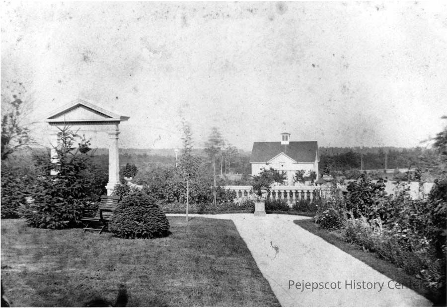 Black & white photograph of the house & gardens at 75 Federal Street, Brunswick, showing view of back lawns, a corniced column archway with a chair. The barn or carriage house is in the far background.