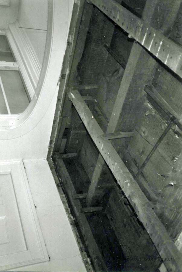 B/W photo of the interior of the walls at 79 Federal Street, Brunswick, ME, under construction. 11/1986.