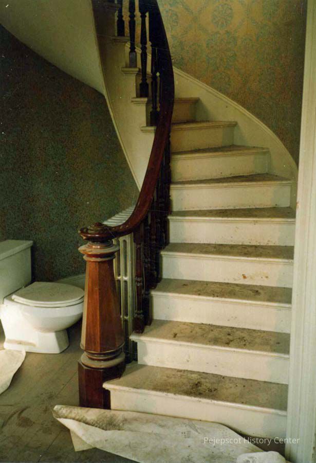 Color photo of the stairs at 79 Federal Street, Brunswick, ME, during renovations. 11/1986.