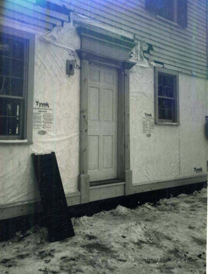 B/W photo of the door before repairs had started at 79 Federal Street, Brunswick, ME. 11/1986.
