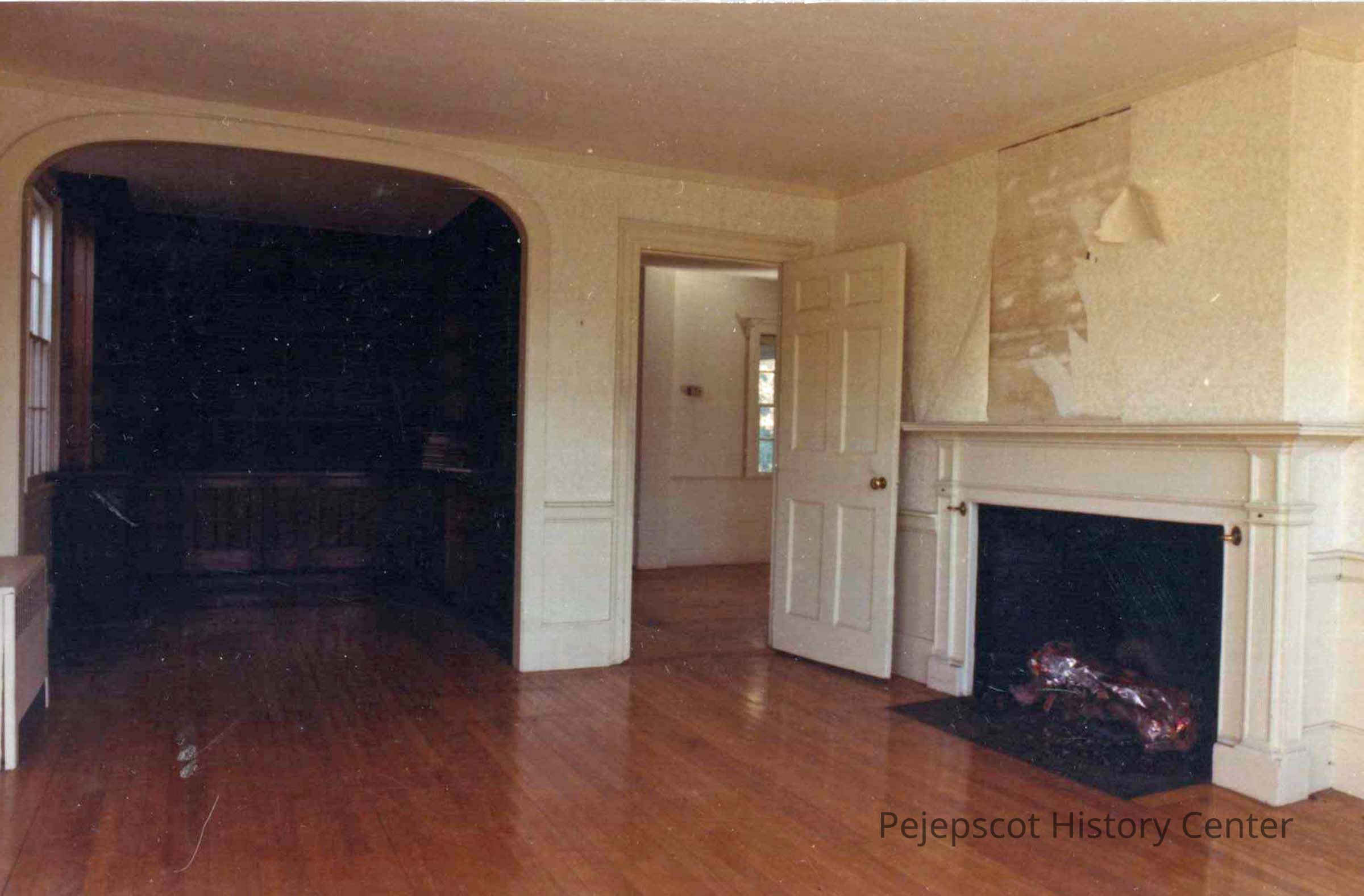 Color photo of the living room at 79 Federal Street, Brunswick, ME, during renovations. 11/1986.