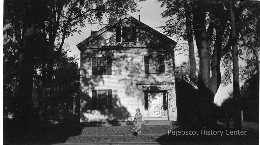 Black and white photograph of 80 Chamberlain St., Brewer, ME, with older woman standing in front of house. On verso in pencil is written, "JLC born in this Brewer, ME house(?) R. Allen." Actually, JLC moved to this house when he was 6 years old.Lexicon