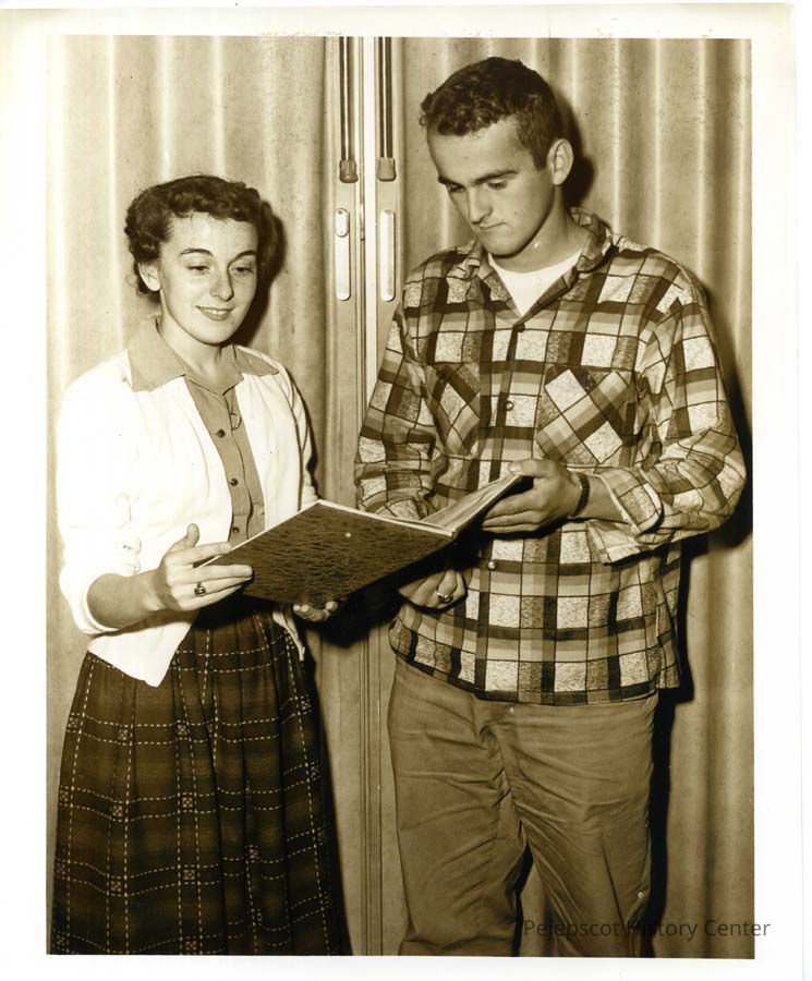 Black and white photograph of ____ Doiron and Dick Snow, co-editors of Brunswick High School yearbook 1957. Undated