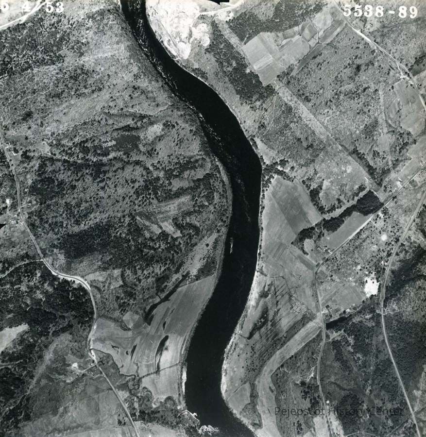 A B/W aerial photograph of the Androscoggin River, River Road. and the Old Pejepscot Road in Topsham. 5/4/1953.