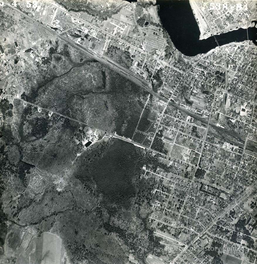 A B/W aerial photograph of the outskirts of Brunswick and the Androscoggin River. 5/4/1953.