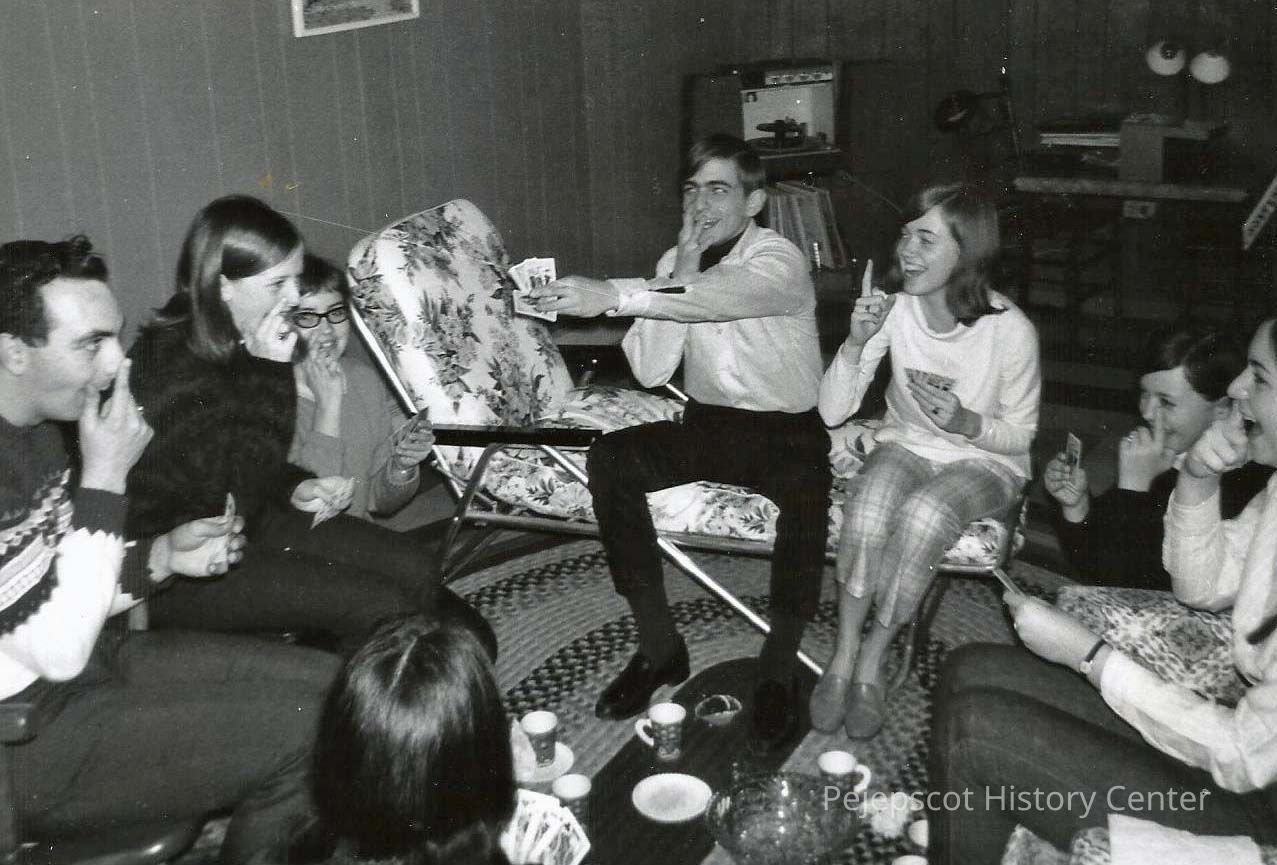 A B/W photograph of a CYO party at Sue McEnnany's house, Winter 1969'