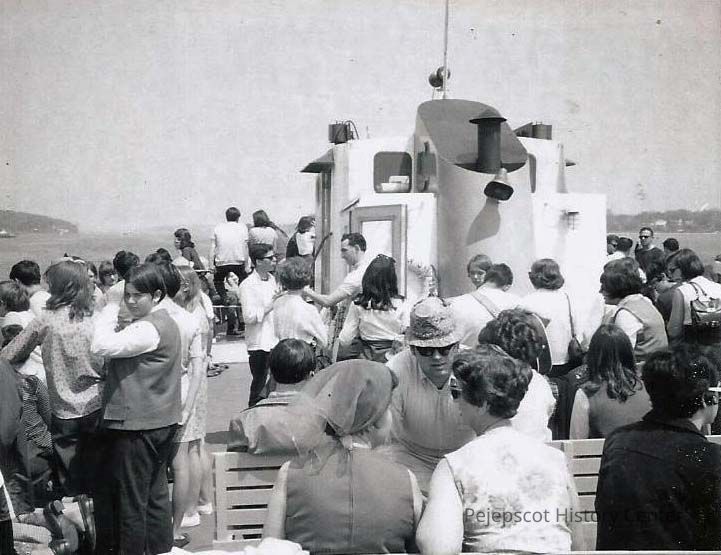 A B/W photograph of a large number of people aboard a boat.