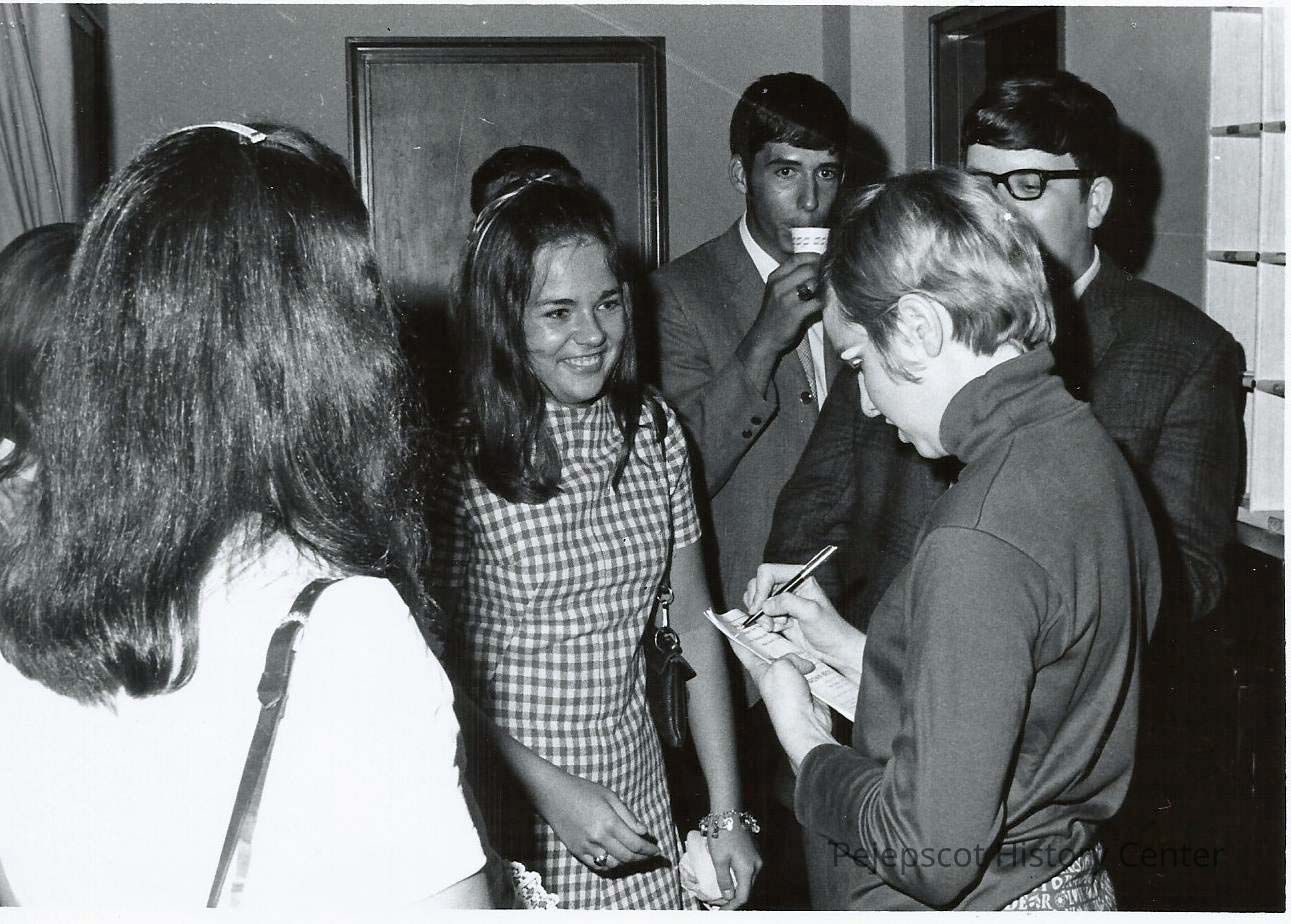 A B/W photograph of a member of the cast of Grease signing autographs.Entry/Object ID