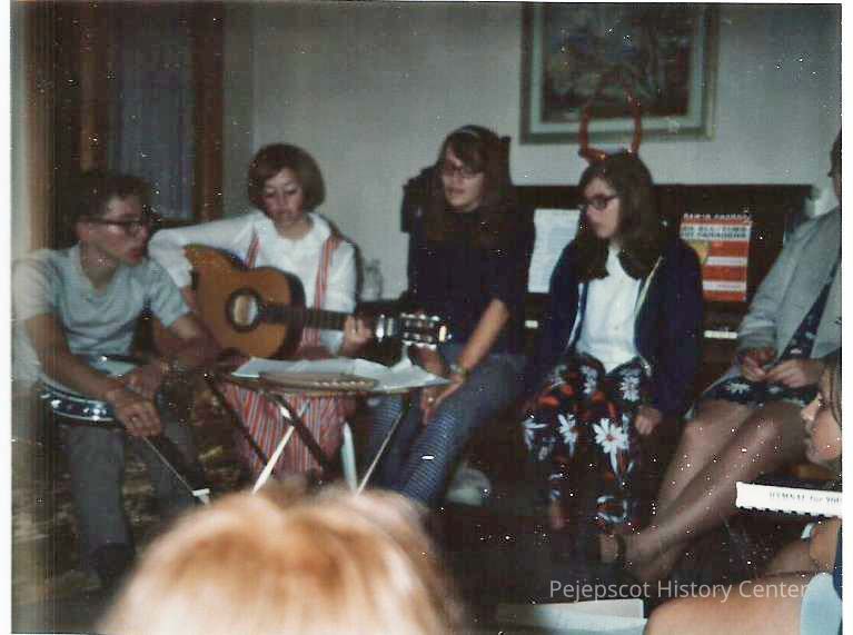 A B/W Polaroid photograph of a group of people sitting around and singing.