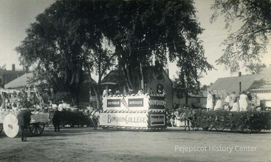 A B/W photograph of a Bowdoin float in a parade in 1916.