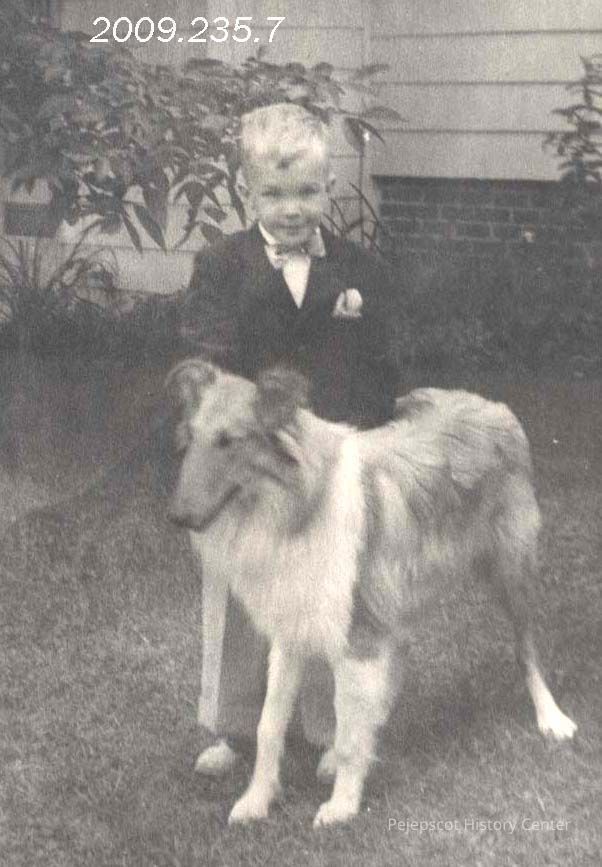 A B/W photograph of a young boy standing with a dog. It is probably David Lee Gordon.