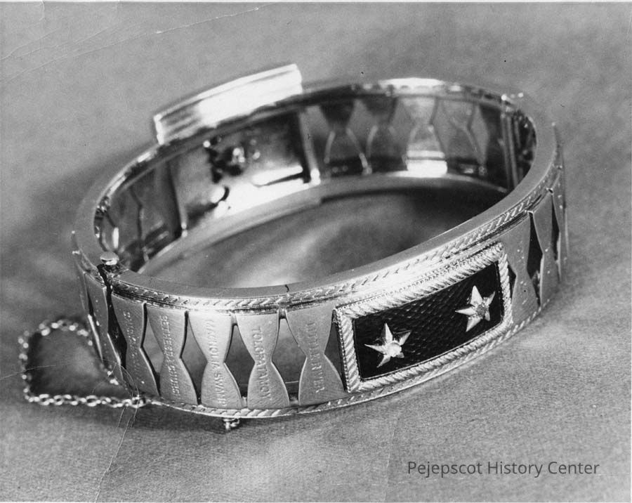 A black and white photo of a bracelet given to Frances Adams Chamberlain by General Joshua L. Chamberlain for their 10th wedding anniversary. This side shows the shoulder straps to Major General (Blue and gold with diamonds). The other side shows a Maltese cross with a diamond in the center. Designed by JLC and bought from Tiffany's in New York for $250.
