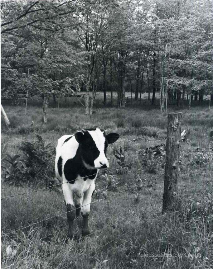 A B/W photo of a calf on Doughty Road, Topsham. 5/1982