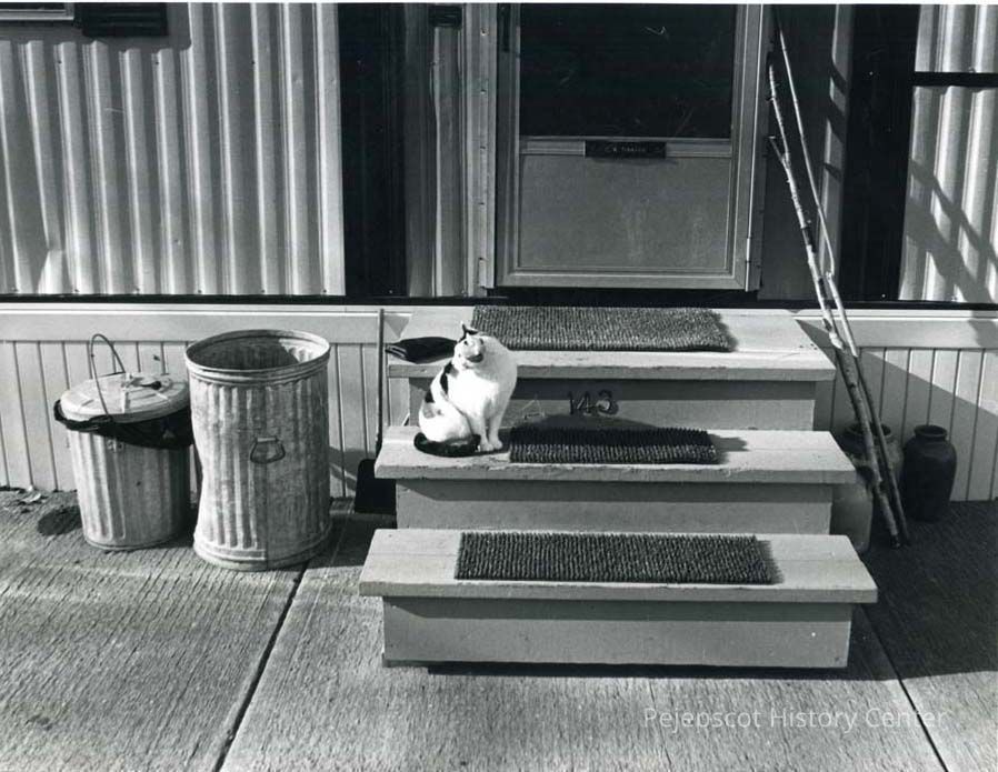 A B/W photo of a cat sitting on the Linnhaven door step.