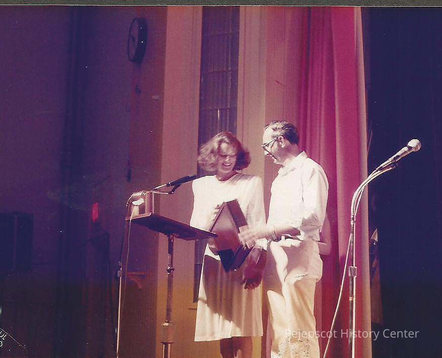 This picture has no caption in the album, but the next picture which is very similar says, "Miss Maine Scholarship Pageant Executive Director Patricia Crooker Mulligan presenting Gene Gagne a brief case for his 25 years of pageant work.Collection
