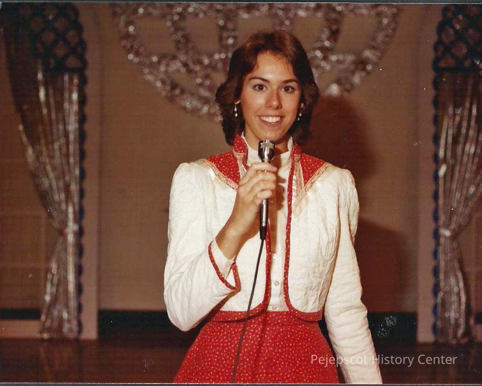 A color photograph of Ann Wright contestant #4 is singing he theme song from "The Rose" for her talent presentation.