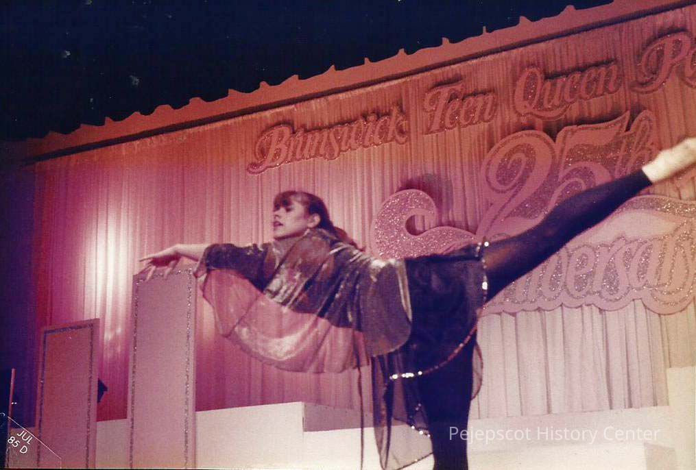 A color photograph of Brunswick Teen Queen Kelley Donovan is preforming a dance routine to the music "Rhapsody in Blue" at the end of the talent competition.
