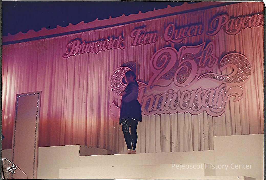 A color photograph of Brunswick Teen Queen Kelley Donovan is preforming a dance routine to the music "Rhapsody in Blue" at the end of the talent competition.