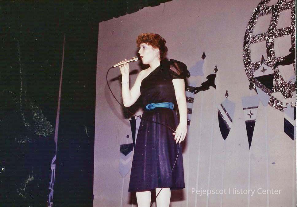 A color photograph of contestant #1 Lucie Morin was singing the theme song from the movie "A Star Is Born" the popular "Evergreen".