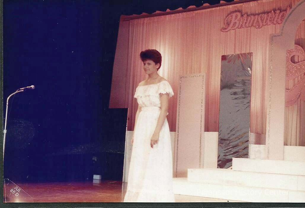 A color photograph of Contestant #2 Elizabeth Wentworth in the pre-judging of the evening gown competition.