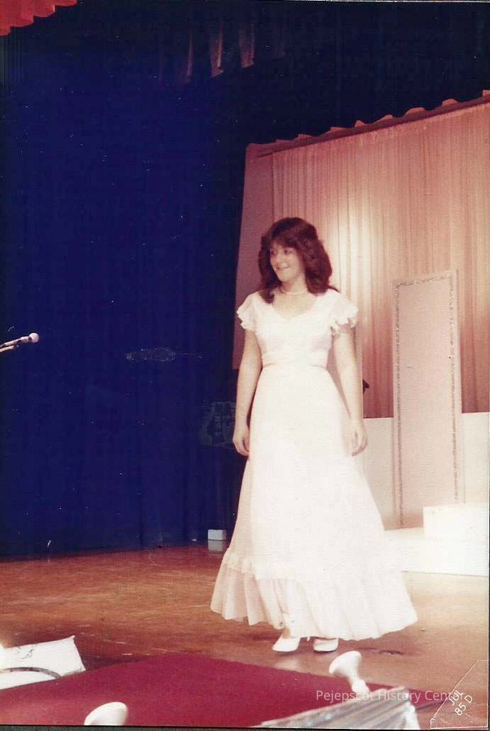 A color photograph of Contestant #4 Heidi St. Pierre in the pre-judging of the evening gown Competition.