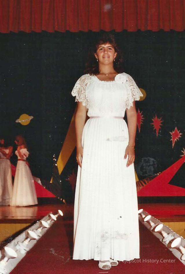 A color photograph of contestant # 5 Cheryl Benoit, who is the daughter of Mr. & Mrs. Harry Benoit of Brunswick. She has one sister Joyce. Cheryl's favorites subject is geometry.