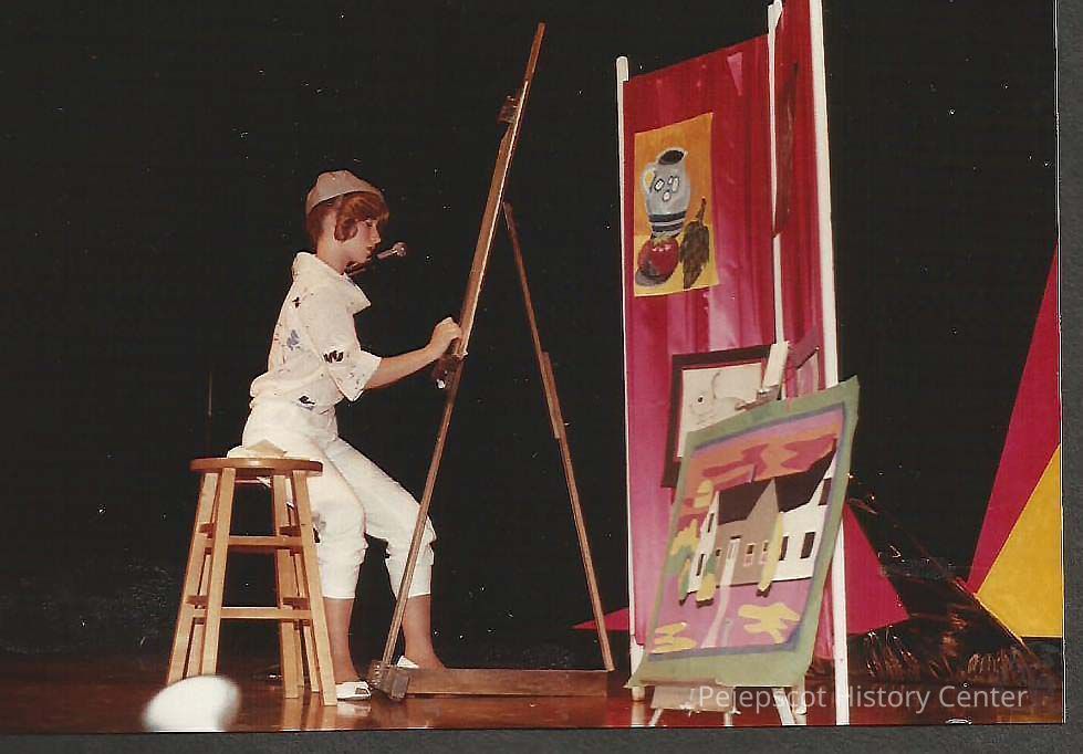 A color photograph of contestant #6 Vicky Brown who is sketching an oil pastel drawing while showing some of her works to the music "Where Have All the Flowers Gone".
