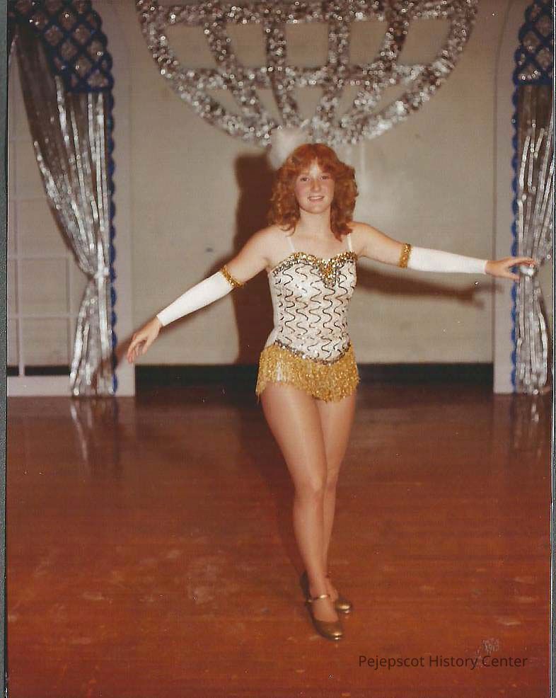 A color photograph of contestant #7 Anita Lashbrook is performing a tap dance routine to the tune of :Once in Love With Amy".