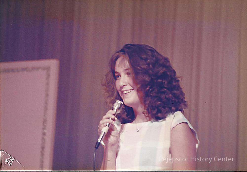 A color photograph of Doreen Derosier Teen Queen Contestant singing for her talent presentation at dress rehearsal. Photographer's # 1-15