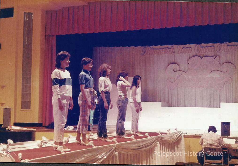 A color photograph of dress rehearsal with the contestants doing quater turns. They are Wendy Mercier, Beth Wentworth, Doreen Derosier, Patty Pickard and Heidi St. Pierre
